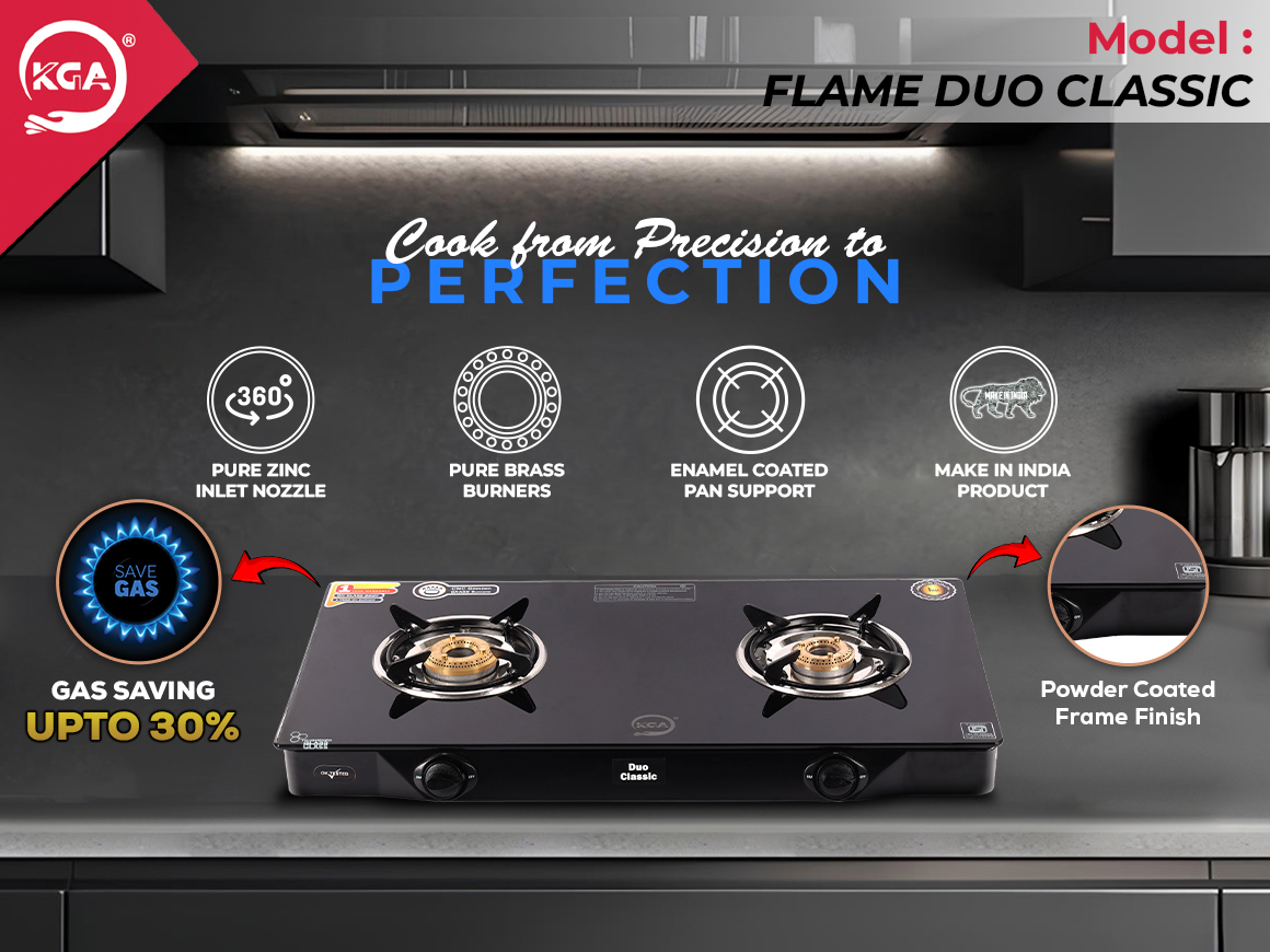The KGA Cook Top Flame Duo Classic 2B (FDC-200) is a high-efficiency, 2-burner gas stove designed for performance and durability. Its sleek frame measures 700mm x 360mm and is powder-coated for a refined finish. Equipped with pure brass burners—one small (69mm) and one large (79mm)—it ensures optimal cooking control with a thermal efficiency of 82%, saving up to 30% on gas. The 5mm thick enamel-coated pan support and 6mm toughened glass top enhance durability, while the 360° rotatable zinc inlet nozzle adds convenience.