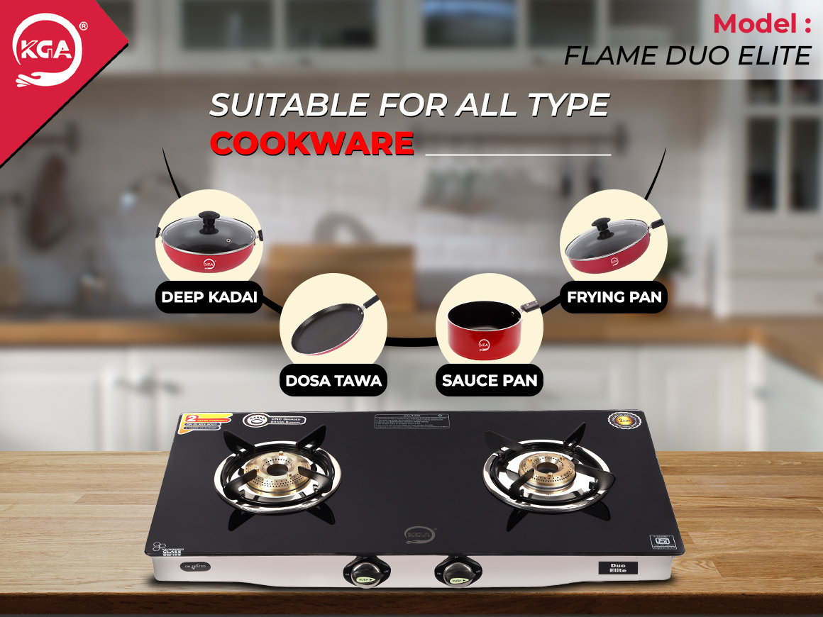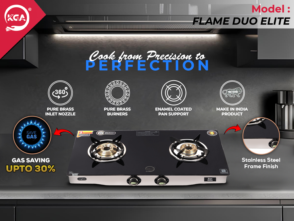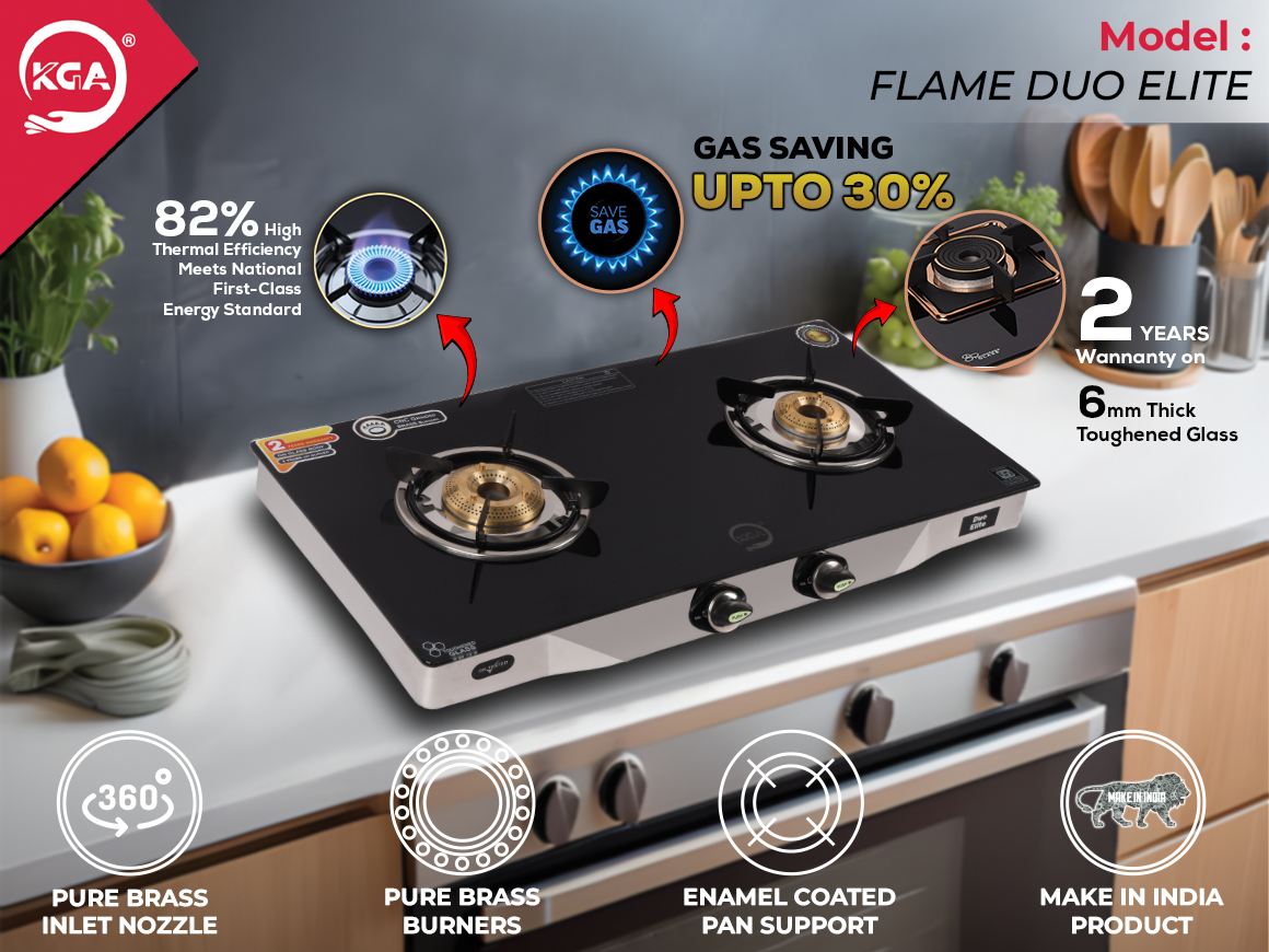 The KGA Cook Top Flame Duo Elite 2B (FDE-210) is a sleek and efficient 2-burner gas cooktop designed for modern kitchens. Featuring a durable frame dimension of 700mm x 360mm and a 6mm thick toughened glass surface, this cooktop combines elegance with robust performance. It includes two pure brass burners – one jumbo high flame (92mm) and one big (79mm) – providing high thermal efficiency of 82%, saving up to 30% on gas. The enamel-coated, 5mm thick pan supports and 360° rotatable pure brass inlet nozzle enhance usability, while the stainless steel frame finish adds a sophisticated touch.