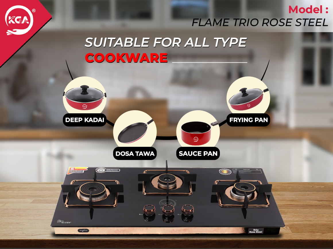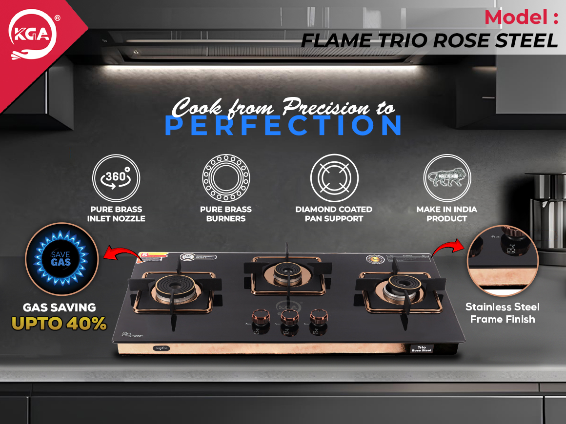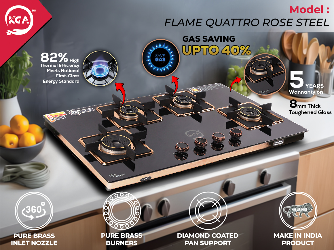 The KGA Cook Top Flame Quattro Rose Steel 4B (FQR-400) combines style and efficiency in an ultra-slim design measuring 800mm X 470mm. It features three durable pure brass burners: one jumbo high flame (92mm), two big (79mm), and one small (69mm), allowing for versatile cooking. The toughened 8mm glass top is paired with a robust 5mm thick diamond-coated pan support for enhanced stability. With an impressive thermal efficiency of 82% and up to 40% gas savings, this cooktop is both economical and effective. Its stainless steel frame, 360° rotating brass inlet nozzle, and brass gas valve further enhance its premium quality and functionality.