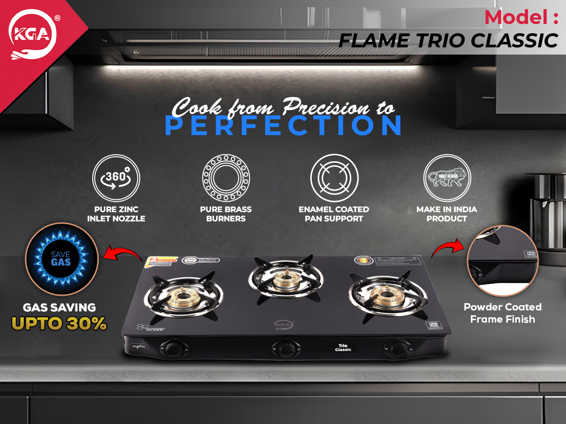 KGA Cook Top Flame Trio Classic 3B (FTC-300) This three-burner cooktop boasts pure brass burners (1 small, 2 big) with 82% thermal efficiency and up to 30% gas savings. Designed with a 690mm x 360mm frame and 6mm toughened glass, it features 5mm enamel-coated pan supports and a pure zinc 360° inlet nozzle for flexibility. The powder-coated finish and pure brass gas valve ensure durability and style, making it a practical, high-efficiency choice for any modern kitchen.