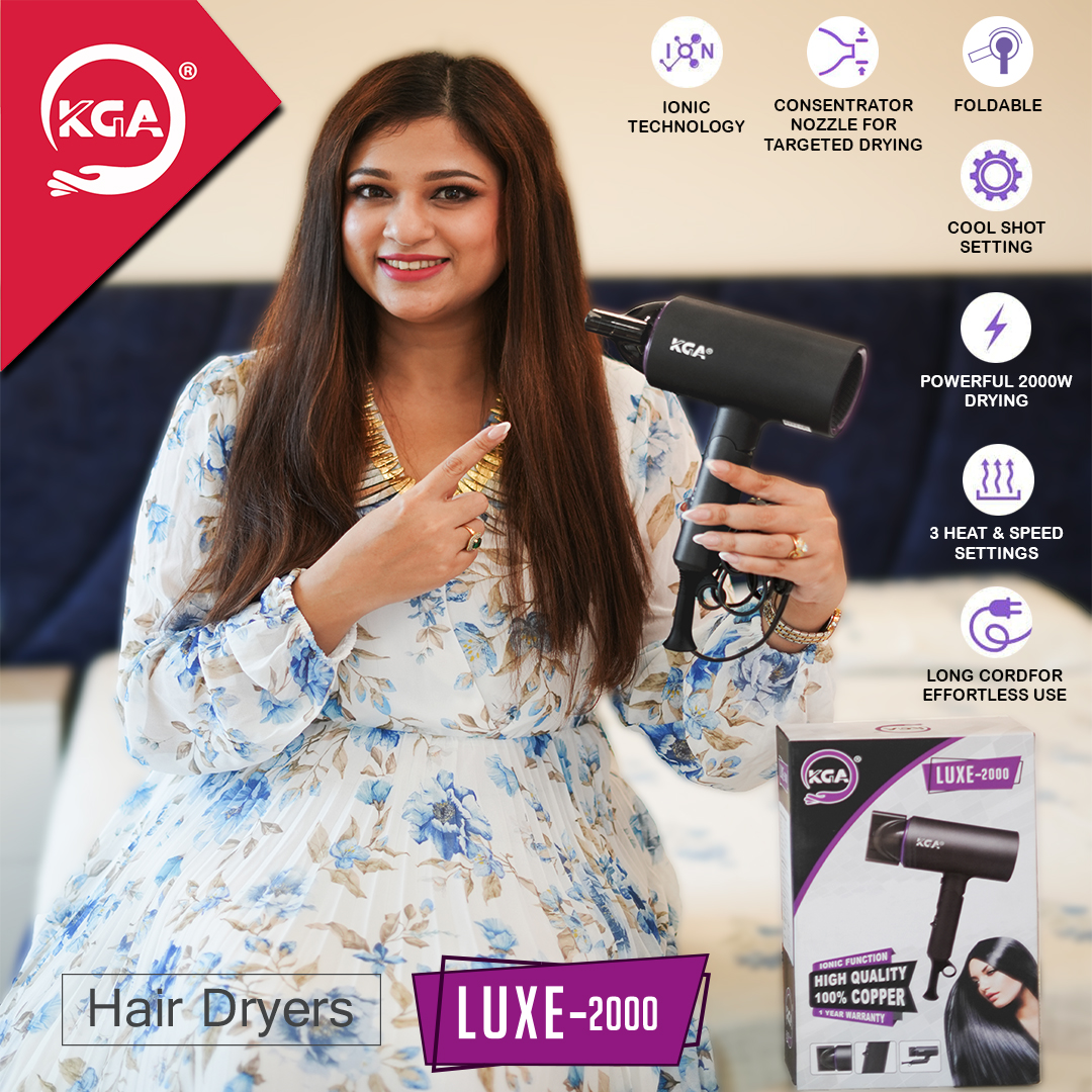 > 360 Degree Air Nozzle – KGA Luxe Hair Dryers come with 360 Degree Air Nozzle: Allows thick, thin, dry, wet, frizzie, oily all kinds of hair to get an all round even heating without loosing its natural moisture. It also helps in quick drying which is Convenient and Time-Saving