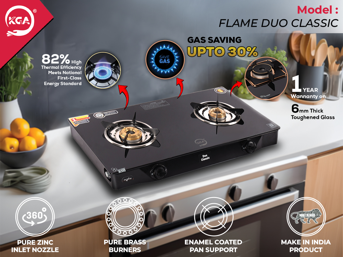 The KGA Cook Top Flame Duo Classic 2B (FDC-200) is a high-efficiency, 2-burner gas stove designed for performance and durability. Its sleek frame measures 700mm x 360mm and is powder-coated for a refined finish. Equipped with pure brass burners—one small (69mm) and one large (79mm)—it ensures optimal cooking control with a thermal efficiency of 82%, saving up to 30% on gas. The 5mm thick enamel-coated pan support and 6mm toughened glass top enhance durability, while the 360° rotatable zinc inlet nozzle adds convenience.