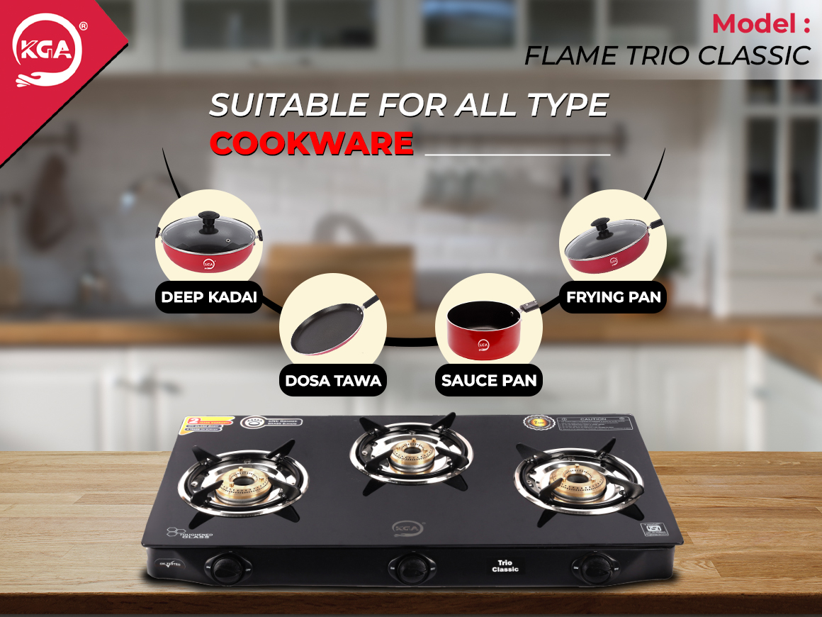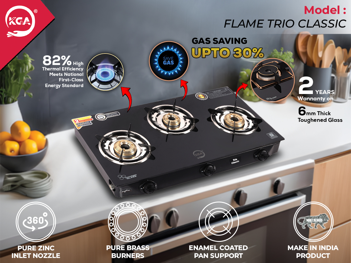 KGA Cook Top Flame Trio Classic 3B (FTC-300) This three-burner cooktop boasts pure brass burners (1 small, 2 big) with 82% thermal efficiency and up to 30% gas savings. Designed with a 690mm x 360mm frame and 6mm toughened glass, it features 5mm enamel-coated pan supports and a pure zinc 360° inlet nozzle for flexibility. The powder-coated finish and pure brass gas valve ensure durability and style, making it a practical, high-efficiency choice for any modern kitchen.