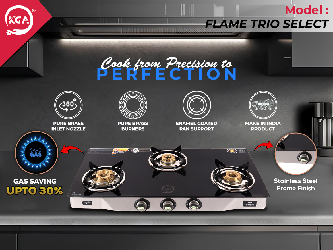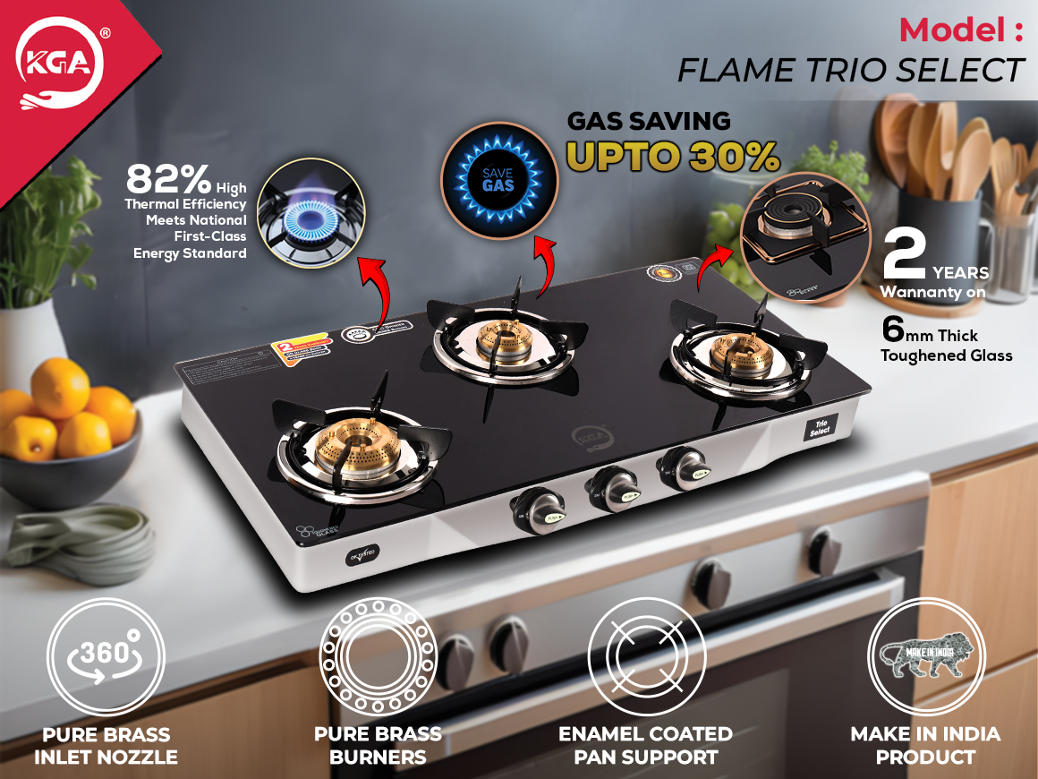 The KGA Cook Top Flame Trio Select 3B (FTS-310) is a 3-burner gas stove featuring a durable 770mm x 380mm stainless steel frame and a toughened 6mm glass top. It includes three pure brass burners—92mm jumbo, 79mm big, and 69mm small—along with enamel-coated, 5mm thick pan supports for stability. A 360° rotatable pure zinc inlet nozzle allows easy setup. With 82% thermal efficiency and up to 30% gas savings, this stove combines high performance with energy efficiency.