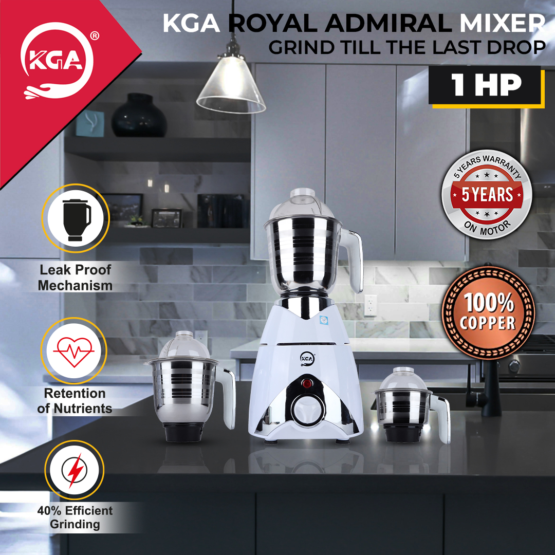 - KGA Royal Admiral mixer with 3 jars made of stainless steel - Liquidizing Jar (Capacity- 1 Ltr.), Grinding Jar (Capacity- 700ml), chutney jar (Capacity- 430ml) with Lid . Sturdy stainless-steel